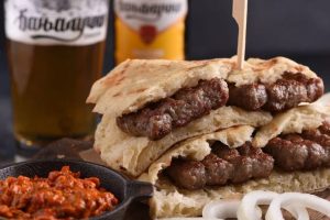 The Cevapi is cooked on coals and has a wonderful Umami taste. Once cooked, the Cevapi is served in Lepinja (or Somun), a unique type of soft, round flatbread, with raw onions. On the side is Kaymak, a local cheese. Another regular condiment is Ajvar: A roasted red pepper sauce that can be used as a spread or a dip. This is a meat-eater’s dream! You must try it.